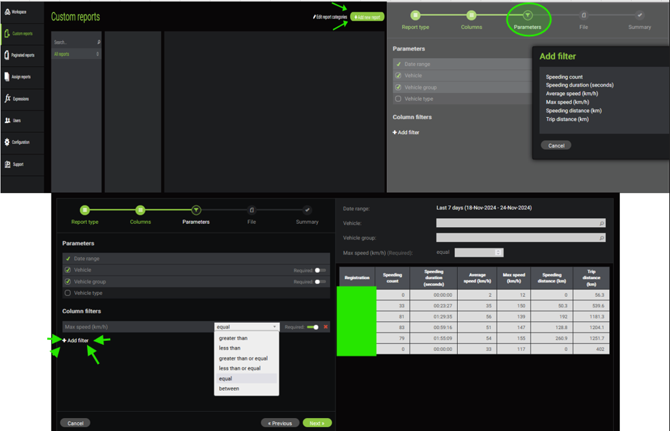 - When creating a custom report in MZone or D-Insight Fleet, you have the option to add filter data, which allows you to filter data by other columns.